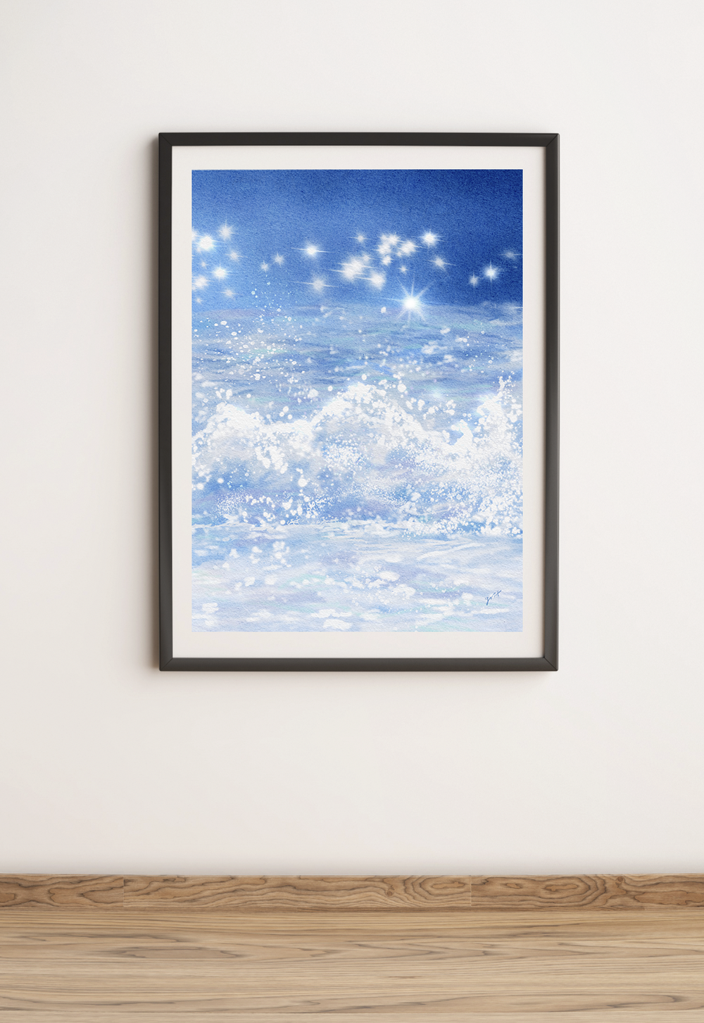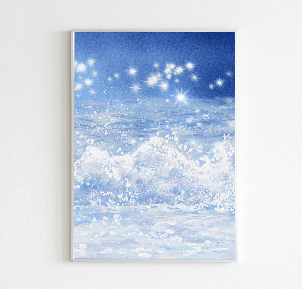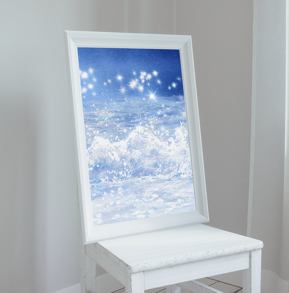 파도에 반짝이는 윤슬이 만났을 때의 신비로운 아름다움을 표현했습니다. 집에 포스터를 걸어놓으시면 시원함을 느끼실 수 있을거예요.