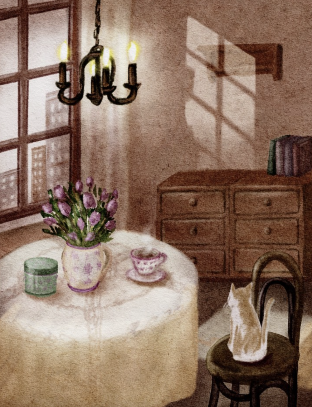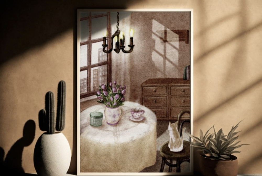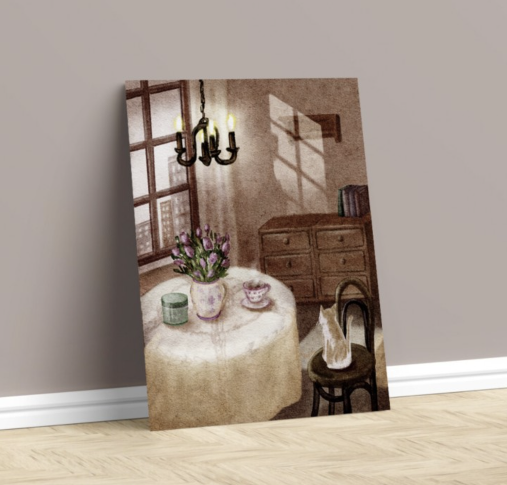 저녁의 은은한 빛이 집안으로 들어오는편안한 느낌을 표현했어요!